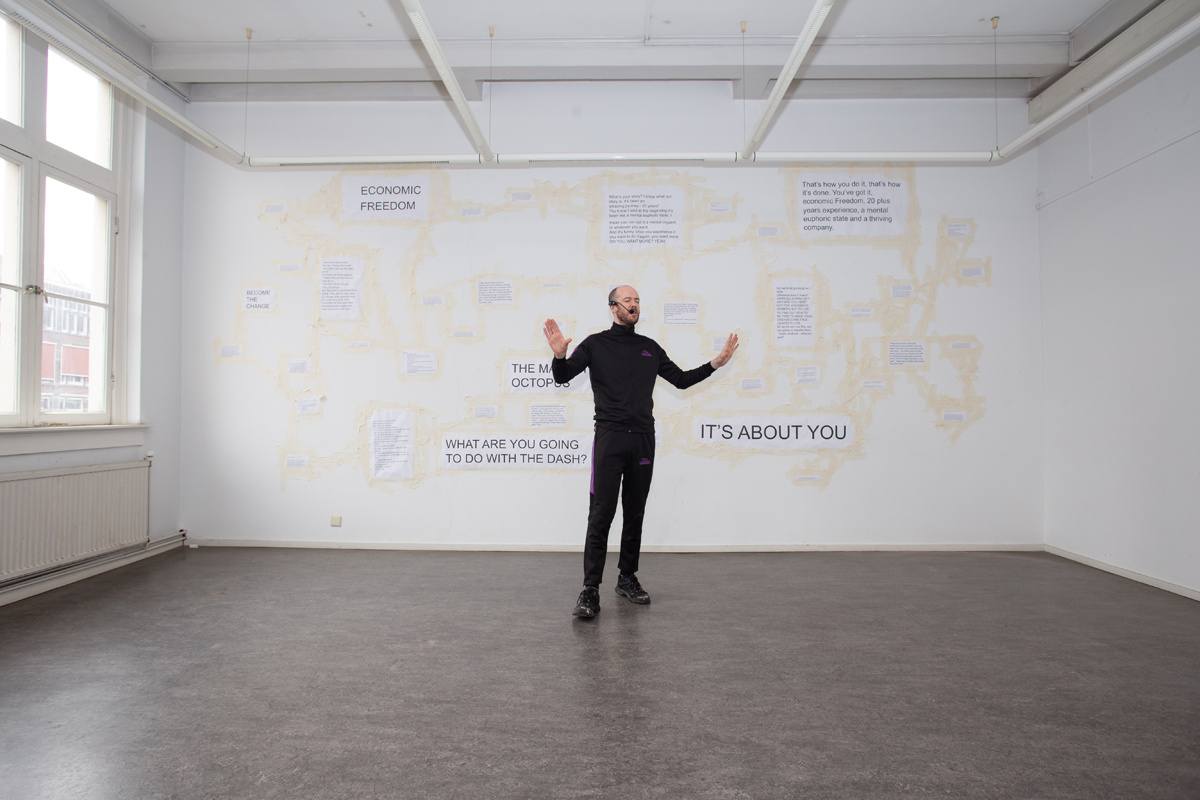 JR Ridinger is the CEO and founder of Market America, a multi level marketing company which has been accused of being a pyramid scheme and racketeering. This performance continues a series of performances exploring the relationship between debt, morality and subjectivity.